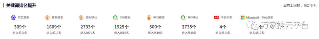 2.關鍵詞上詞數:10218個,各個營銷渠道相關關鍵詞均在百度搜索、百度移動、搜狗搜索、搜狗移動、360搜索、360移動、神馬搜索、*頭條、Bing搜索等搜索引擎平臺占據有利排名。